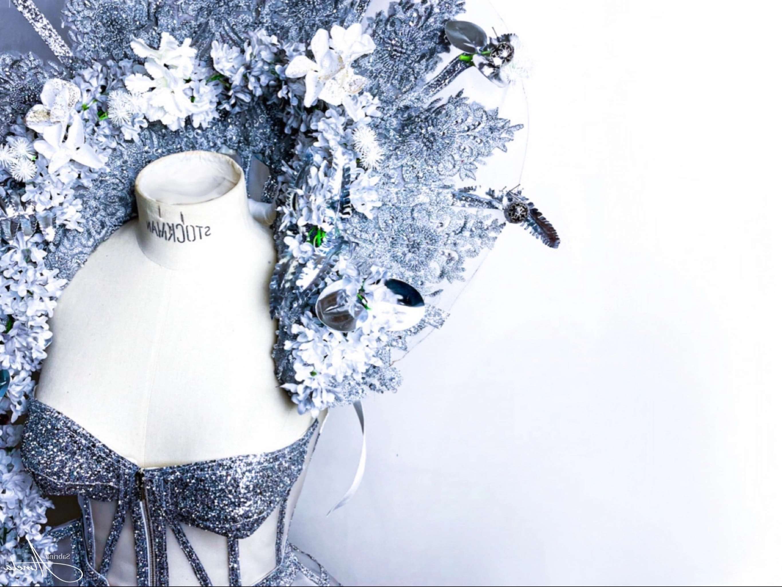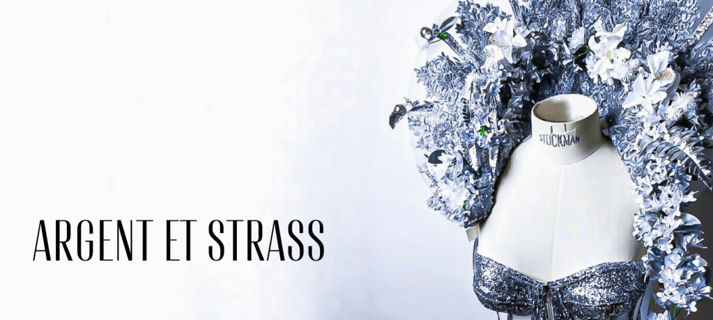 Costume en plusieurs éléments argenté brillant. Brille sous les projecteurs grâce à un tissus réfléchissant ! Composé d’une robe blanche, d’un corset, d’une jupe, d’un dossard et d’un string sur mesure, celui-ci est adapté au numéro d’effeuillage. Le tout est agrémenté de fleurs et de strass cousus main.