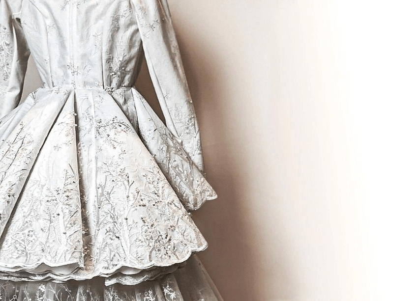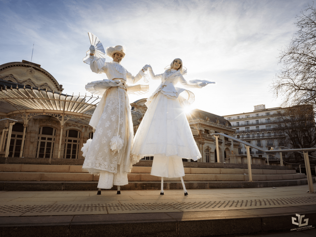 Chaque pièce de ce costume d’échasses laisse transparaître la lumière et met en avant la dentelle blanche. L’élégance est soulignée par des petites décorations argentées (boutons, chaines). Le costume s’accorde parfaitement aux autres personnages féériques